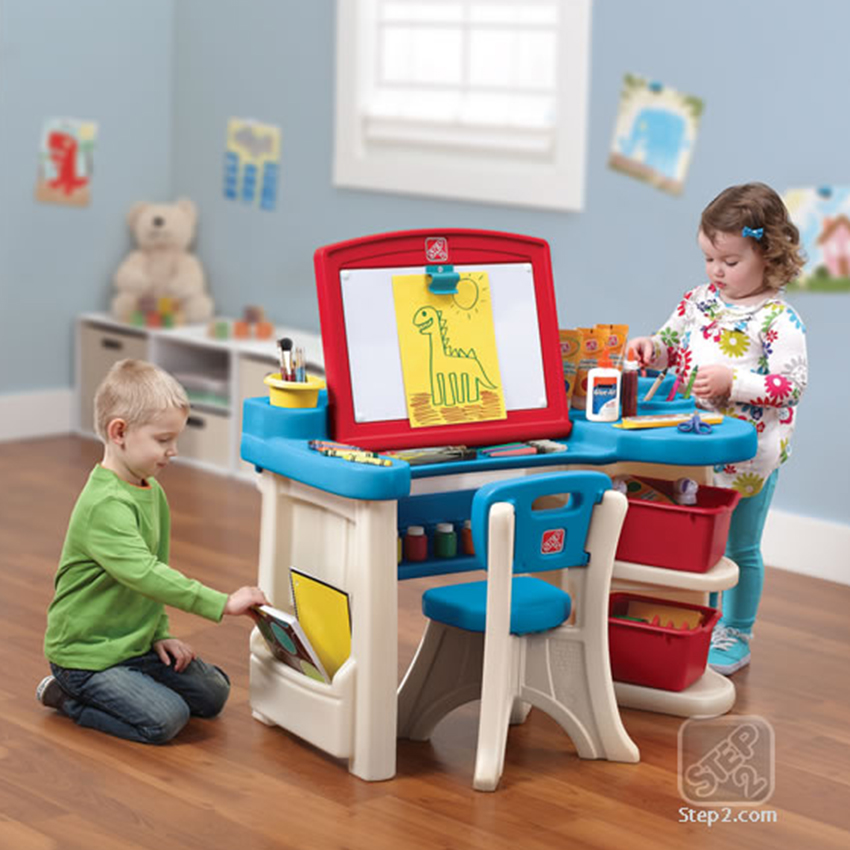 Step2 #843100 Studio Art DeskThe Studio Art Desk features an adjustable work surface board where kids can fold down the board into an art desk to draw on or lift up for an art easel where children can craft artistic masterpiecesThe large side pockets of the art desk are perfect for notebooks, coloring books, paper and moreRemovable supply cup for brushes, pencils, markers, and more